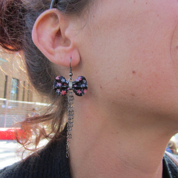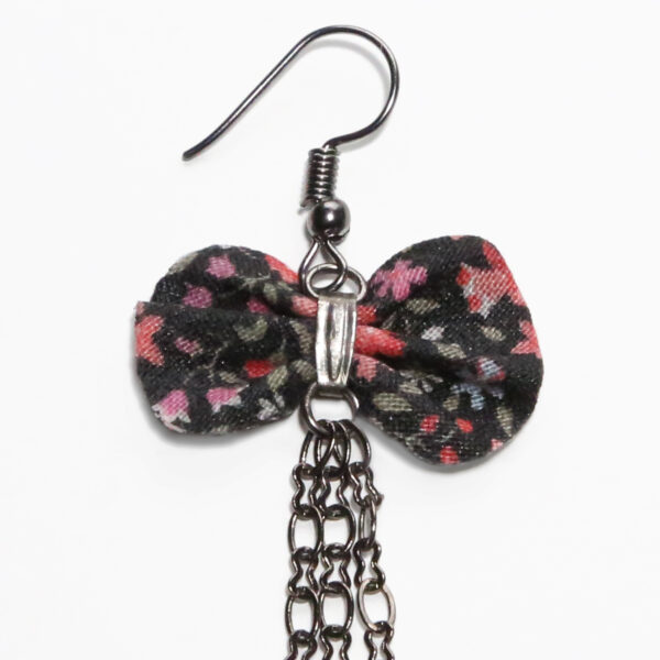 Boucle d’oreille fleurie – Noeud en tissu recyclé noir et rose