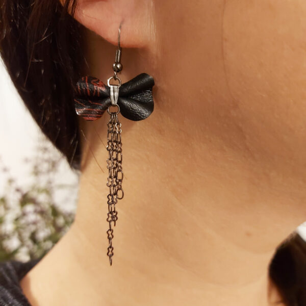 Ajoutez une note d’originalité à votre look avec ces boucles d’oreilles asymétriques en cuir noir et rouge peints à la main. Commandez la vôtre dès maintenant pour adopter un style unique et respectueux de l’environnement.