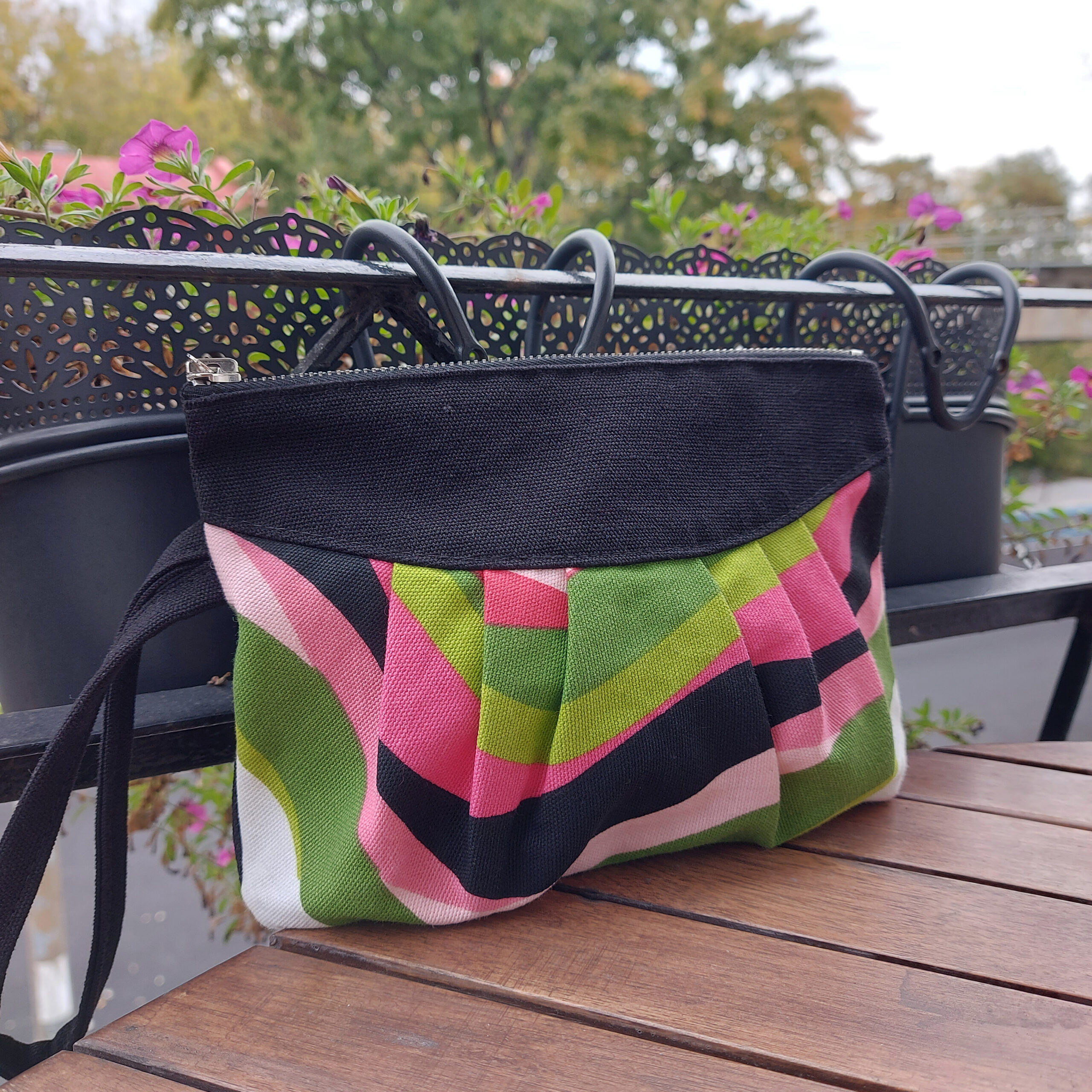 Fabriquée à la main avec du denim et du coton imprimé vague rose, vert et blanc, ce mini sac incarne la féminité avec son joli plissé au devant.